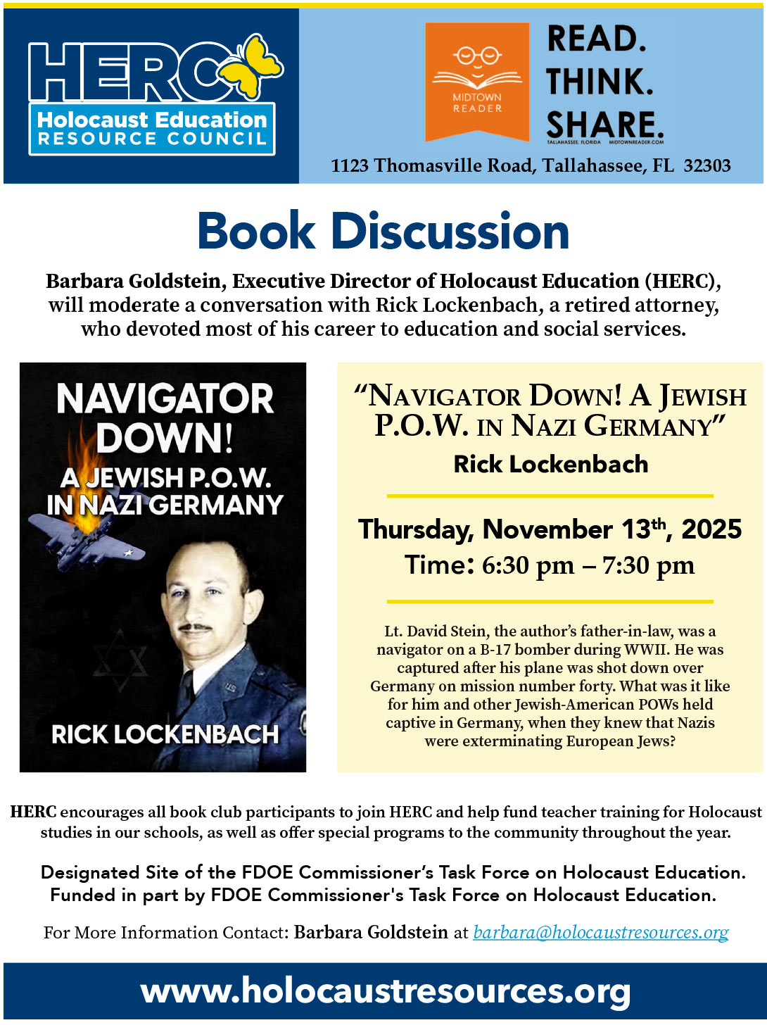 13nov6:30 pm7:30 pm“Navigator Down! A Jewish P.O.W. in Nazi Germany”6:30 pm - 7:30 pm(GMT-05:00) Midtown Reader Bookstore, 1123 Thomasville Road, Tallahassee, FL 32303
