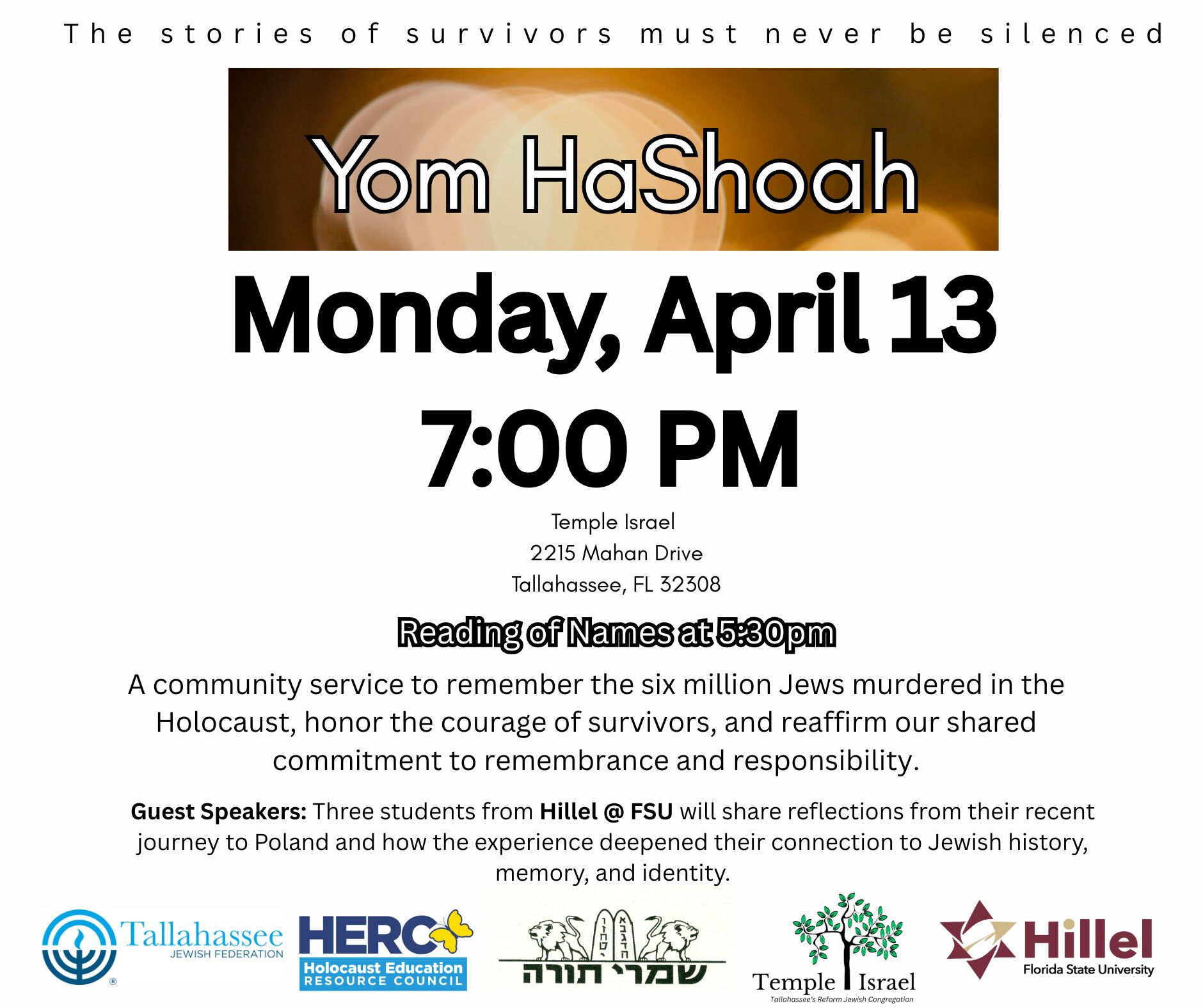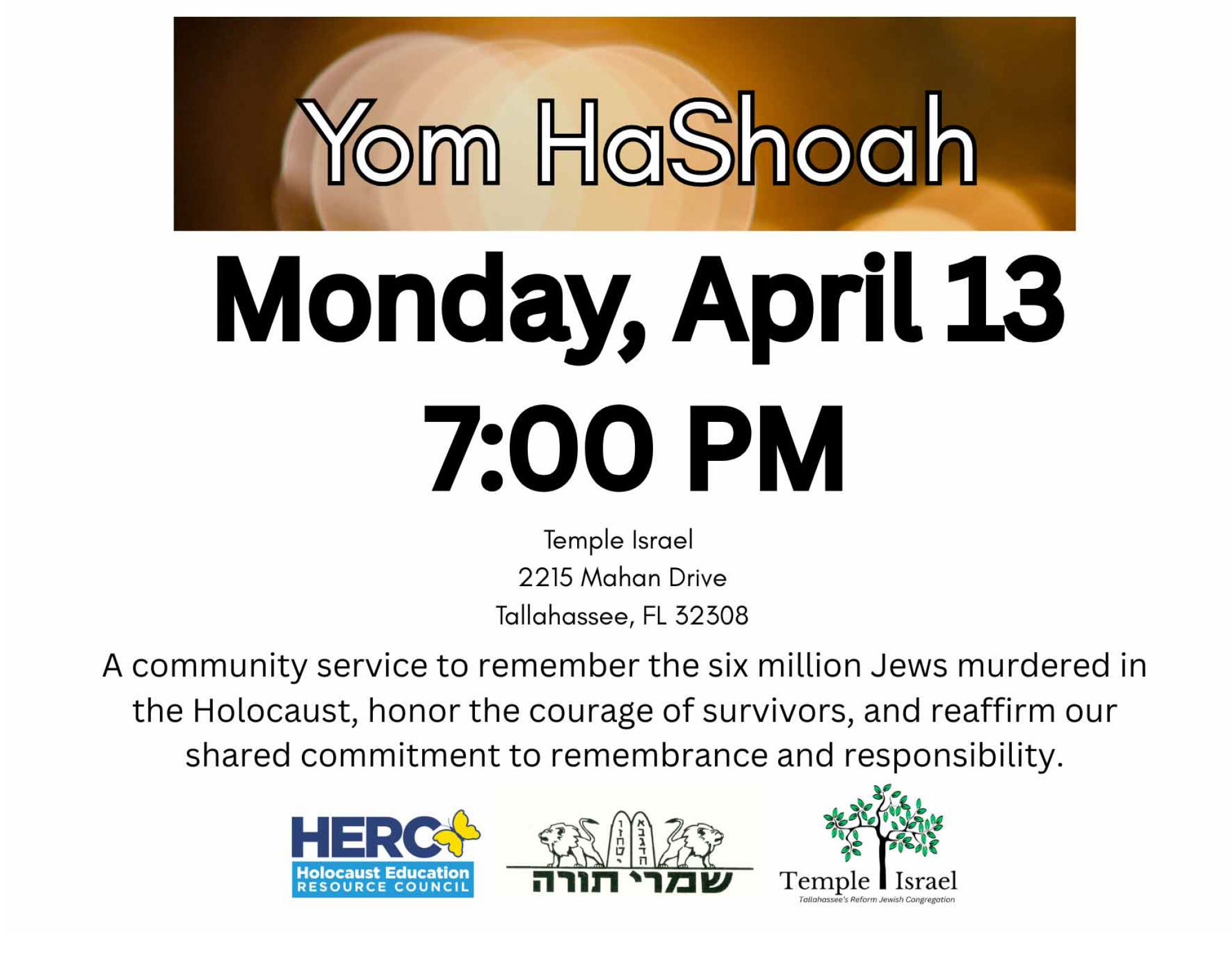13apr7:00 pm7:00 pmSave The Date Yom HaShoah7:00 pm - 7:00 pm(GMT-04:00) Temple Isreal, 2215 Mahan Drive